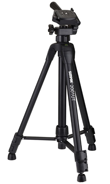 Light duty tripod that extends to 48.9". Three leg sections and weighs 2.3 lb. Supports up to 4.4 lb. Lift and lock center column. The tripod has a 3-way pan-head with quick release.